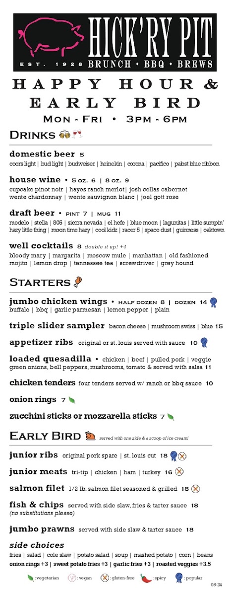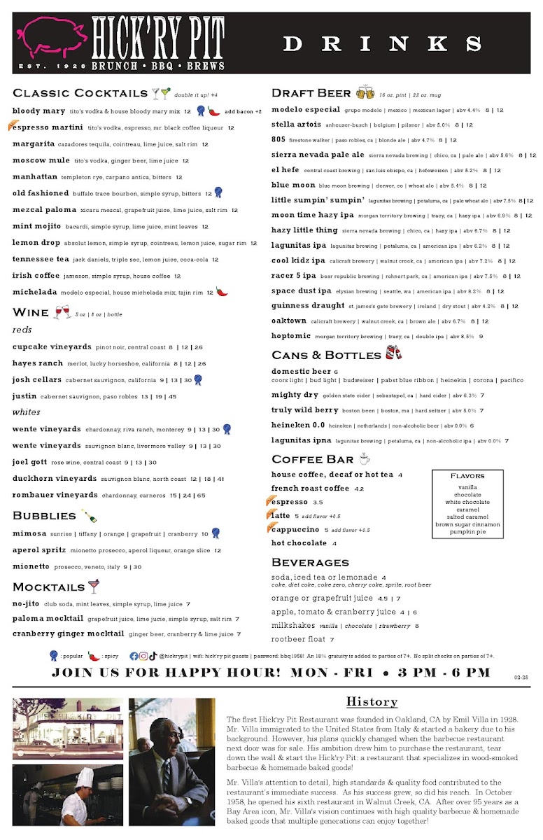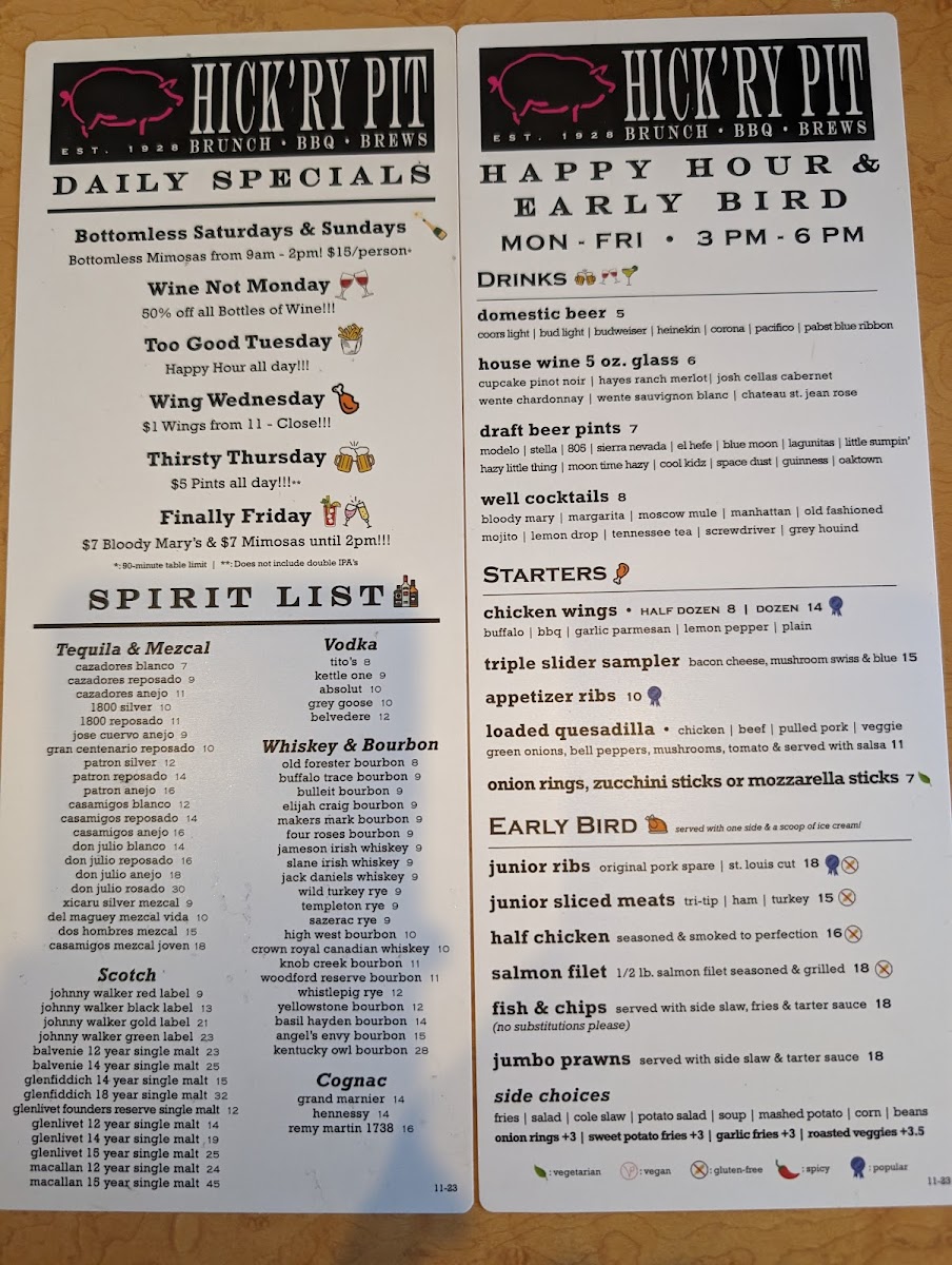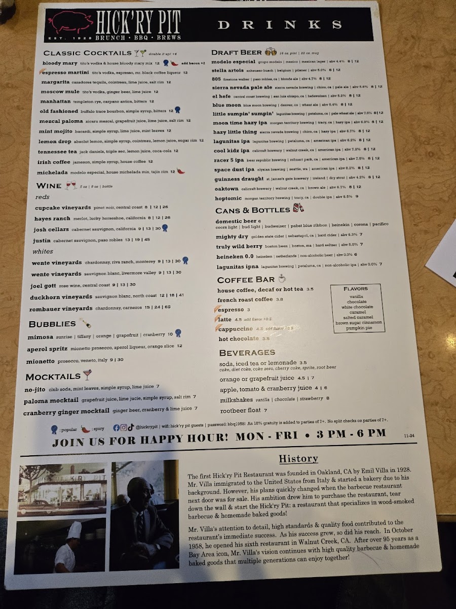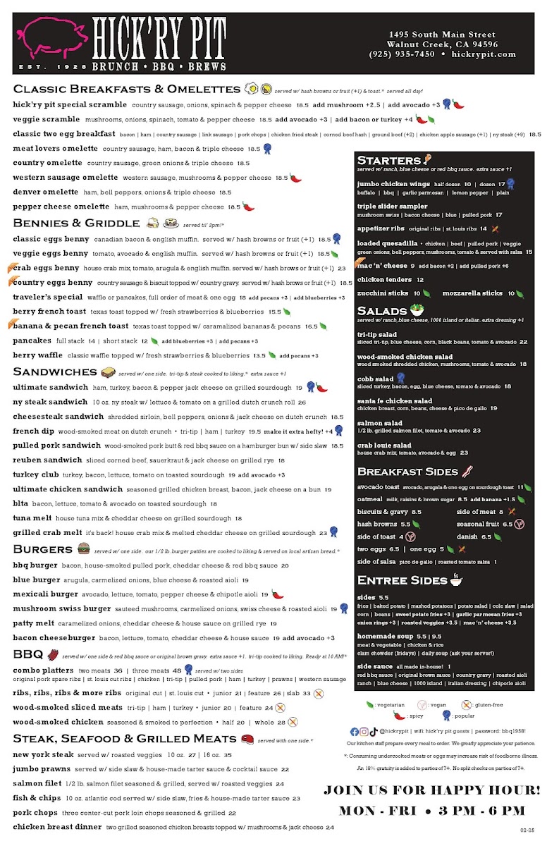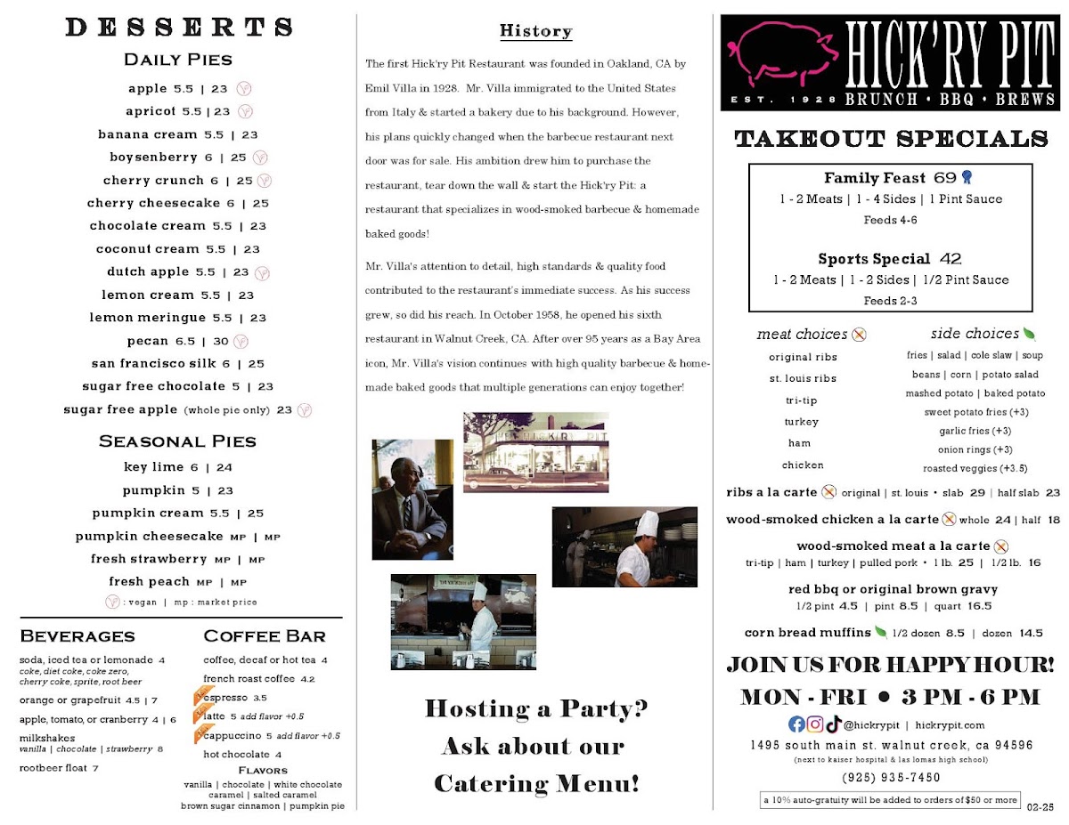 If you're in the mood for a hearty, flavorful meal, look no further than the The Original Hick'ry Pit Menu. Nestled in Walnut Creek, CA, this classic spot on S Main Street is known for its warm, inviting atmosphere and mouthwatering dishes. Whether you're craving tender smoked meats, savory sides, or a sweet finishing touch, each dish on the menu is crafted with care and packed with flavor. The smoked ribs and brisket are fan favorites, offering a perfect balance of smoky depth and juicy tenderness. And don’t forget the homemade sides - they perfectly complement every main dish. It’s the kind of place where each bite feels like comfort food at its finest, making it the ideal spot to kick back and enjoy a satisfying meal with friends and family.
